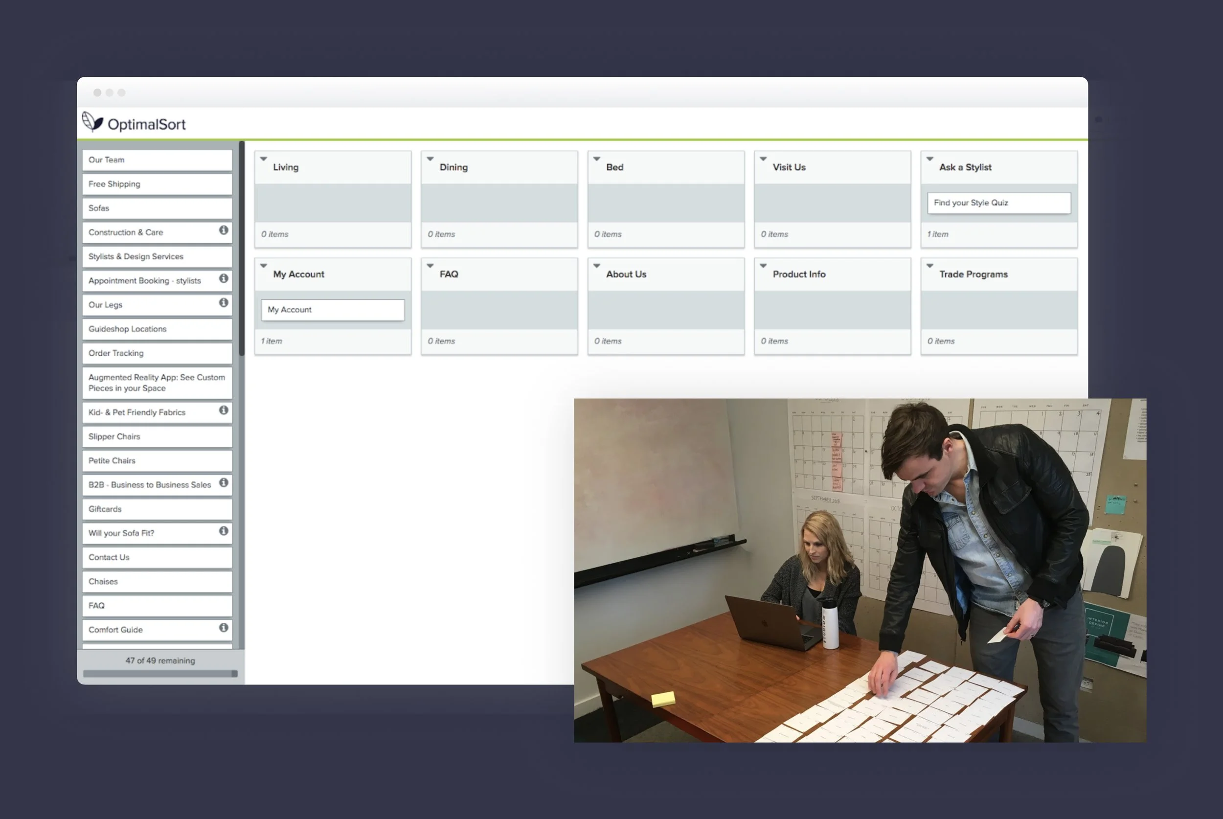 With the bones of a new IA from card sorting, I used tree testing to refine category naming and test different versions. We saw that Customers expected products grouped by room and often confused sectionals with sofas.
